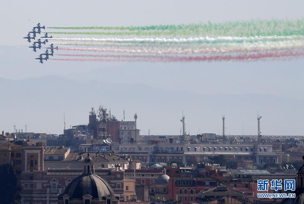 当日,意大利“三色箭”飞行表演队在意大利首都罗马举行飞行表演,庆祝意大利空军建立98周年。
