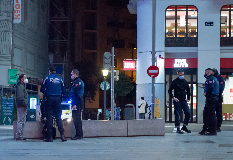 ↑3月27日晚,警察在西班牙马德里市中心检查宵禁后仍在街上的人们的证件。