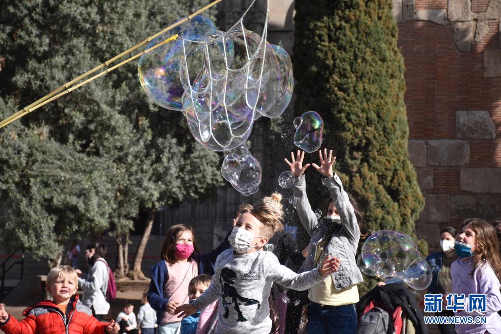 3月30日,小朋友们在西班牙巴塞罗那主教堂广场玩耍。