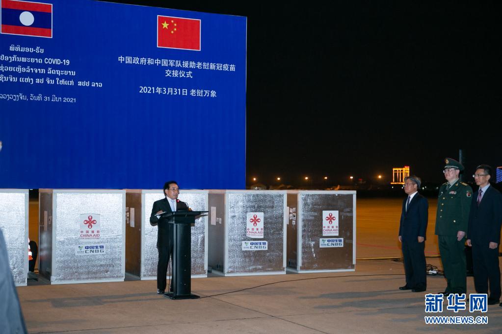 3月31日,老挝政府总理潘坎在首都万象瓦岱国际机场举行的中国政府和中国军队援助老挝新冠疫苗交接仪式上致辞。