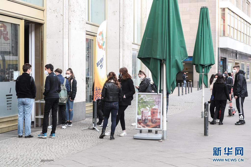 4月1日,人们在德国首都柏林的饮品店外排队。