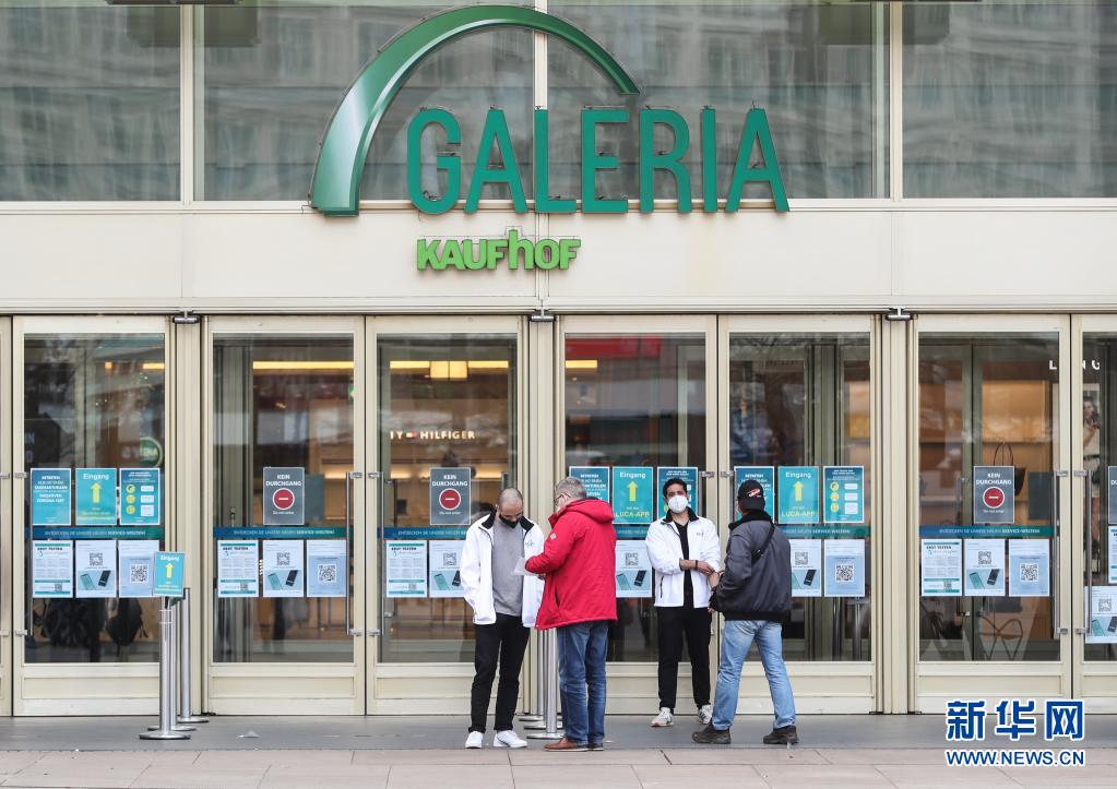 4月1日,工作人员在德国首都柏林的购物中心入口处查验顾客的核酸检测证明或预约信息。