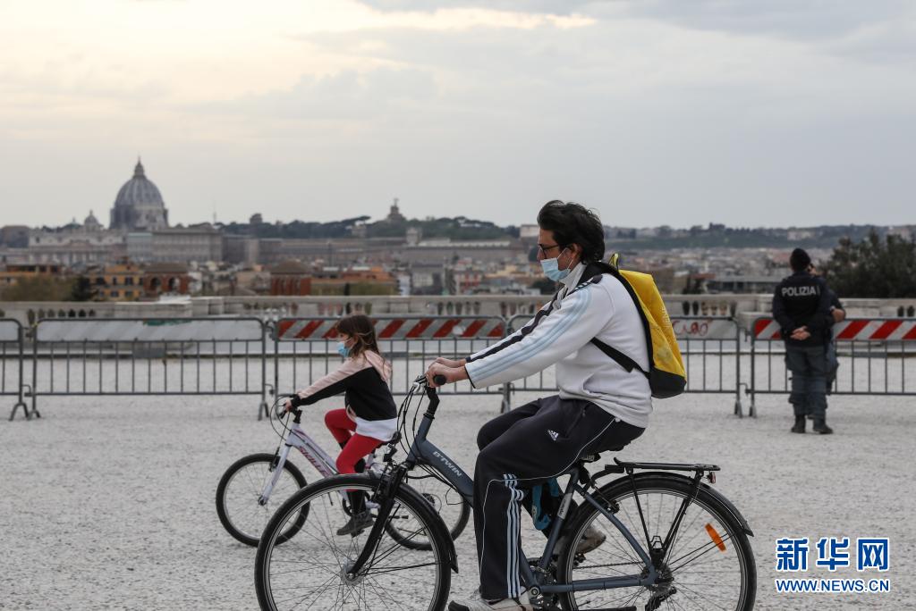 4月3日,人们骑车经过意大利罗马的苹丘观景台。