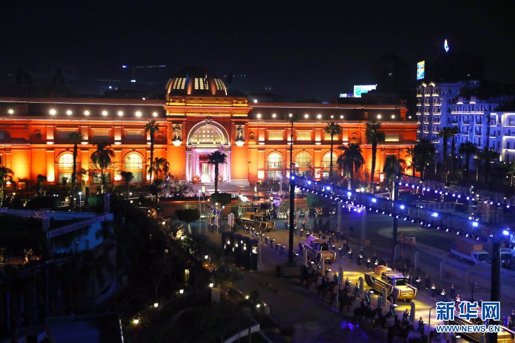 4月3日,在埃及首都开罗解放广场,用于运送木乃伊的金色定制花车驶离埃及国家博物馆。埃及政府3日晚在开罗举办盛大游行活动和交接仪式,将现藏于埃及国家博物馆的22具古埃及法老和王后的木乃伊转移至埃及文明博物馆,以打造新的旅游热点。新华社发(艾哈迈德·戈马摄)