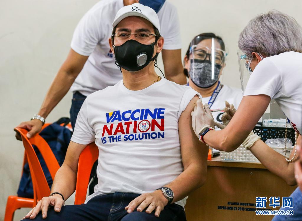 4月4日,菲律宾马尼拉市市长莫雷诺在马尼拉接种中国科兴新冠疫苗。