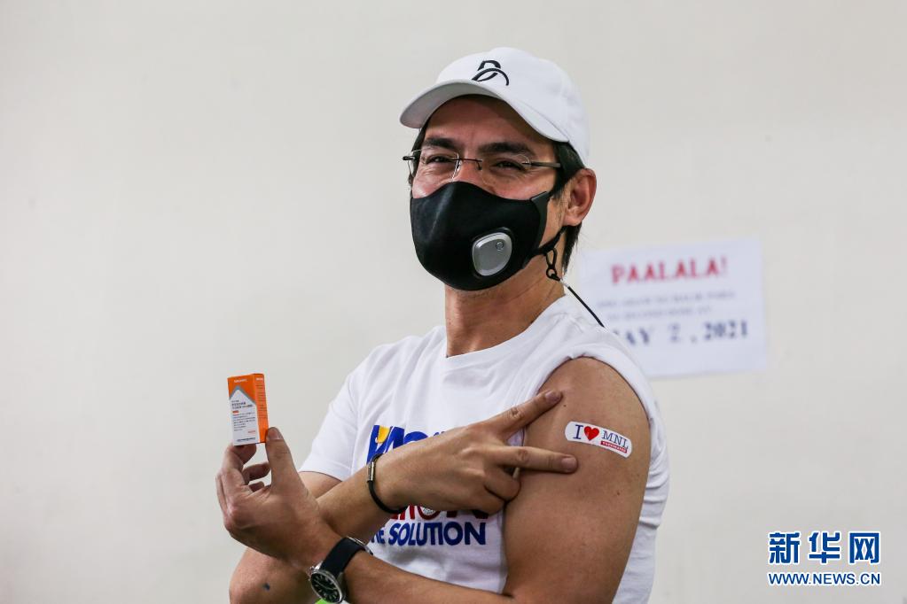 4月4日,菲律宾马尼拉市市长莫雷诺在马尼拉接种中国科兴新冠疫苗后手举疫苗盒子。