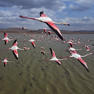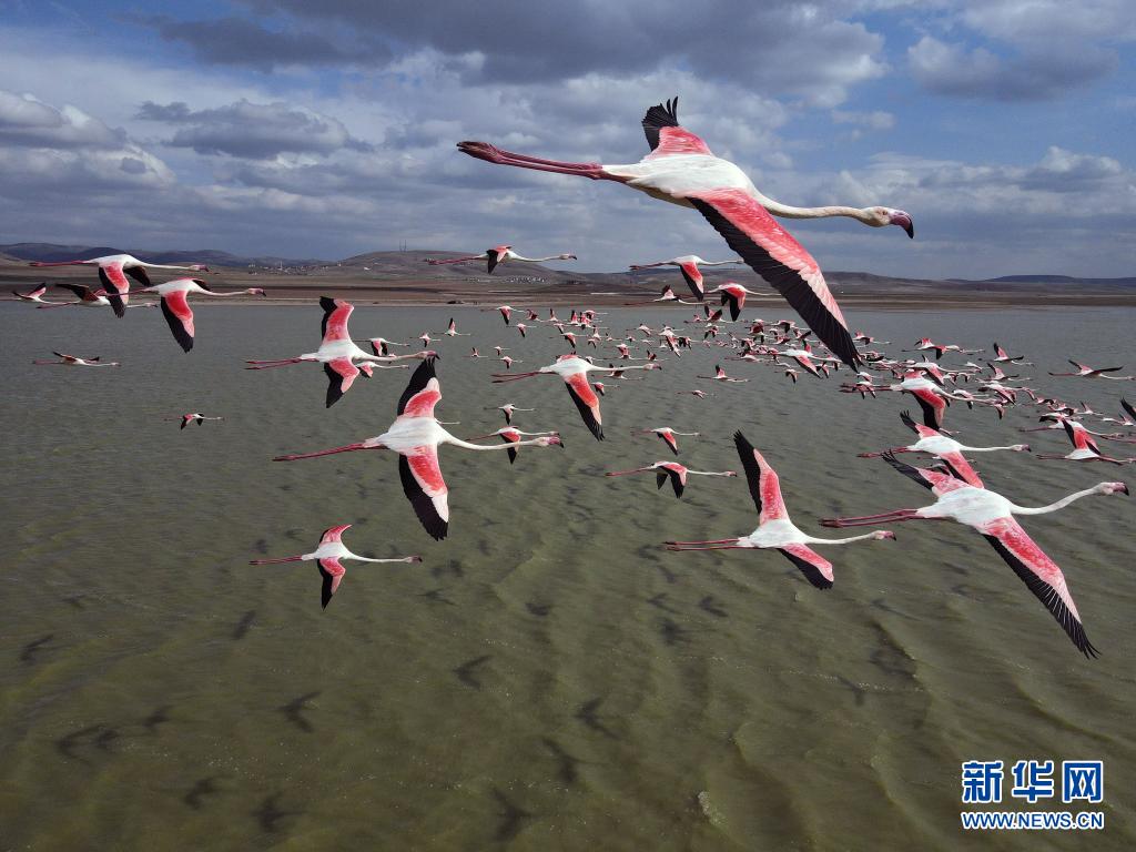 4月4日,一群火烈鸟飞过土耳其安卡拉的莫甘湖(航拍照片)。新华社发(穆斯塔法·卡亚摄)