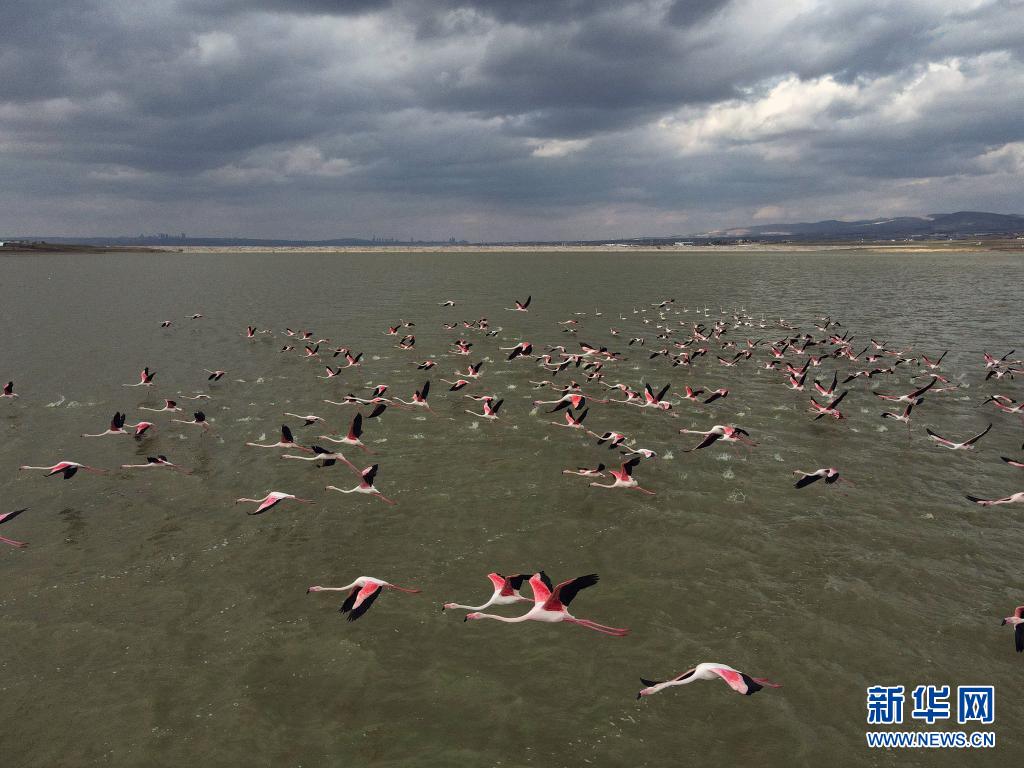 4月4日,一群火烈鸟飞过土耳其安卡拉的莫甘湖(航拍照片)。新华社发(穆斯塔法·卡亚摄)