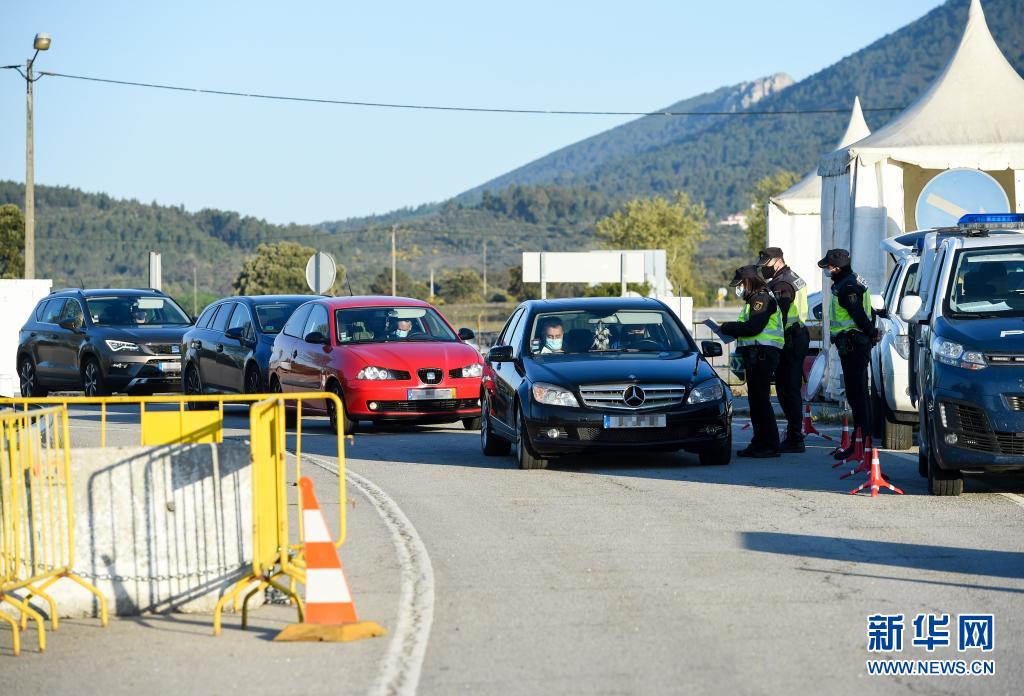 4月5日,工作人员在西班牙大萨尔萨和葡萄牙蒙福尔蒂纽边境处检查过往车辆。