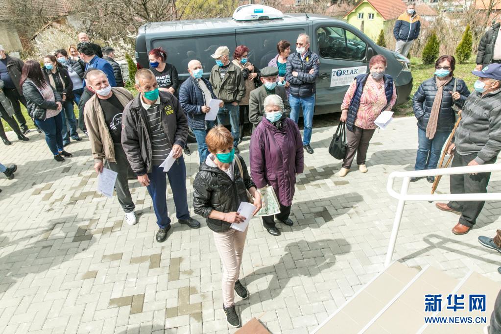 4月6日,民众在塞尔维亚东部马伊丹佩克市鲁德纳格拉瓦村卫生防疫站门口排队等待接种新冠疫苗。