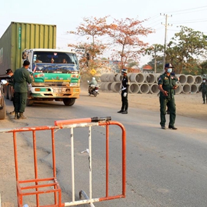 4月7日,柬埔寨警方在磅士卑省和干丹省的交界处设置路障禁止人员跨省流动。
