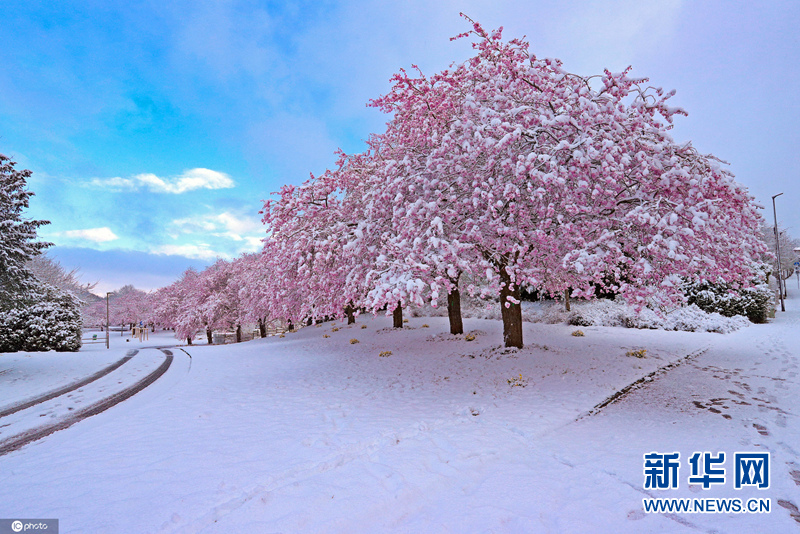当地时间4月6日,德国锡根,当地迎来降雪,春雪里的樱花美如画卷。(图片来源:东方IC)