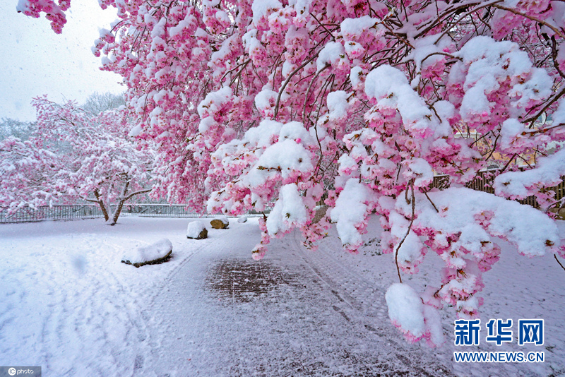 当地时间4月6日,德国锡根,当地迎来降雪,春雪里的樱花美如画卷。(图片来源:东方IC)