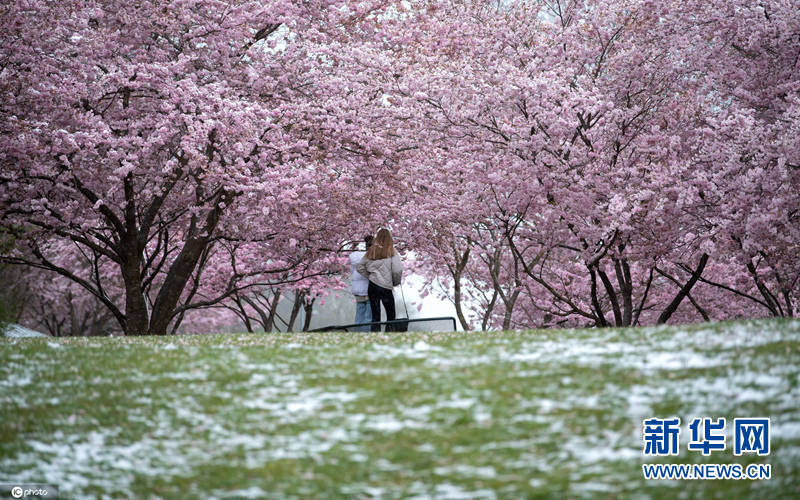 当地时间4月6日,德国慕尼黑,当地迎来降雪,春雪里的樱花美如画卷。 (图片来源:东方IC)