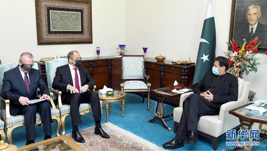 巴基斯坦总理伊姆兰·汗和外长库雷希7日在巴首都伊斯兰堡分别同到访的俄罗斯外长拉夫罗夫举行会谈,双方同意加强在能源、贸易、军事和抗疫等领域的合作。新华社发(巴基斯坦媒体信息部供图)