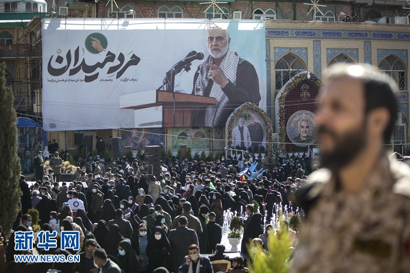2021年1月2日,人们在位于伊朗克尔曼的伊斯兰革命卫队下属“圣城旅”指挥官苏莱曼尼墓附近参加他的遇难周年悼念活动。2020年1月3日,美国在伊拉克首都巴格达发动袭击,杀死伊朗伊斯兰革命卫队下属“圣城旅”指挥官苏莱曼尼等人。新华社发(艾哈迈德·哈拉比萨斯摄)