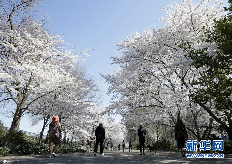 当地时间4月8日,美国纽约,中央公园里樱花盛放,吸引游客观赏。(图片来源:东方IC)