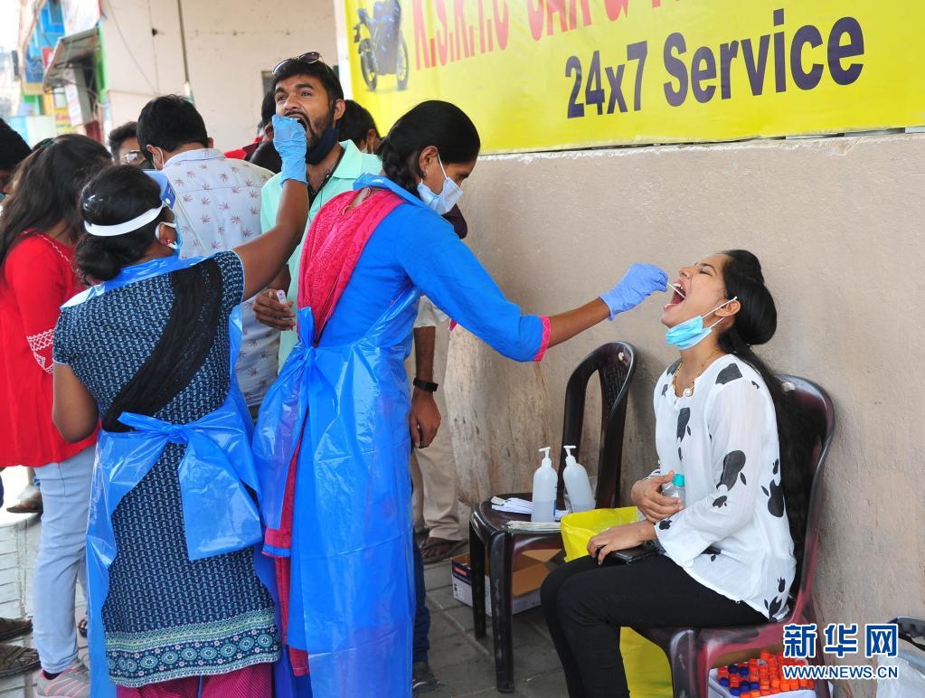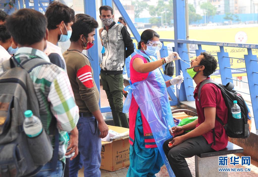 4月11日,人们在印度班加罗尔的一个公交站接受新冠病毒检测取样。新华社发