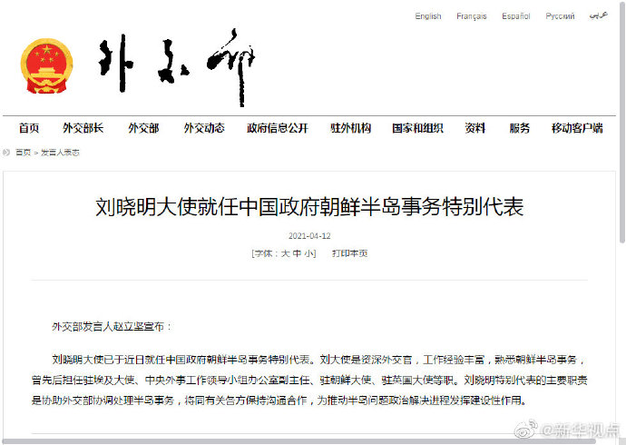 外交部发言人赵立坚4月12日宣布:刘晓明大使已于近日就任中国政府朝鲜半岛事务特别代表。赵立坚说,刘大使是资深外交官,工作经验丰富,熟悉朝鲜半岛事务,曾先后担任驻埃及大使、中央外事工作领导小组办公室副主任、驻朝鲜大使、驻英国大使等职。刘晓明特别代表的主要职责是协助外交部协调处理半岛事务,将同有关各方保持沟通合作,为推动半岛问题政治解决进程发挥建设性作用。