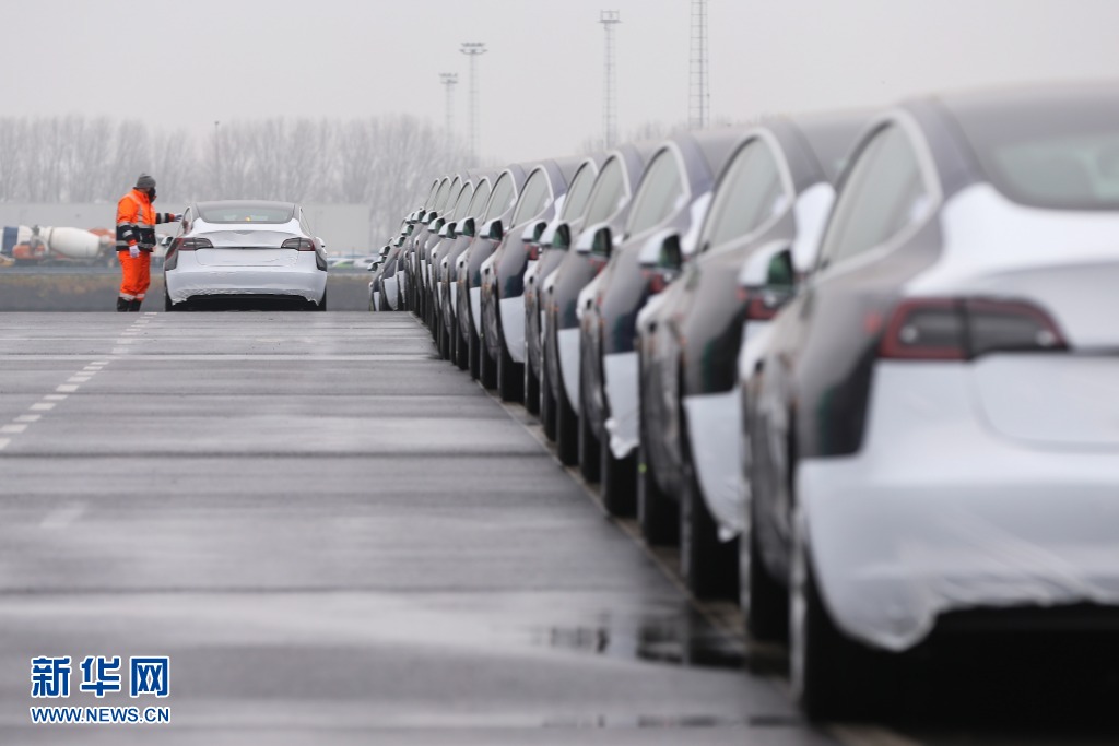 2020年11月27日,工作人员在比利时泽布吕赫港对中国制造的特斯拉Model 3汽车进行装卸作业。(新华社记者郑焕松摄)
