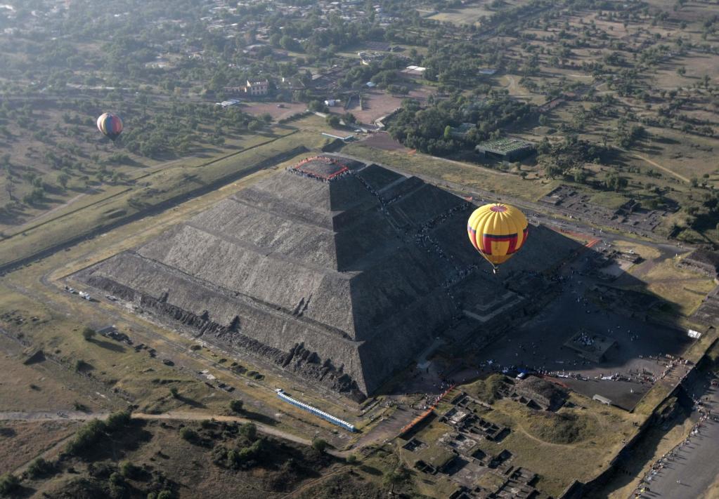 2010年3月21日,热气球在日出时分从墨西哥首都墨西哥城附近特奥蒂瓦坎的太阳金字塔上空飞过,庆祝春分的到来。(新华社/路透)