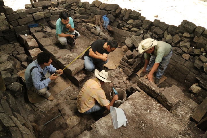 在科潘遗址的考古发掘现场,李新伟和中洪考古队成员正在分析重要遗迹现象。(社科院考古所供图)