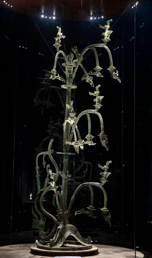 这是在位于四川省广汉市的三星堆博物馆拍摄的1986年出土于三星堆2号“祭祀坑”的青铜神树(2021年3月17日摄)。(新华社记者沈伯韩摄)