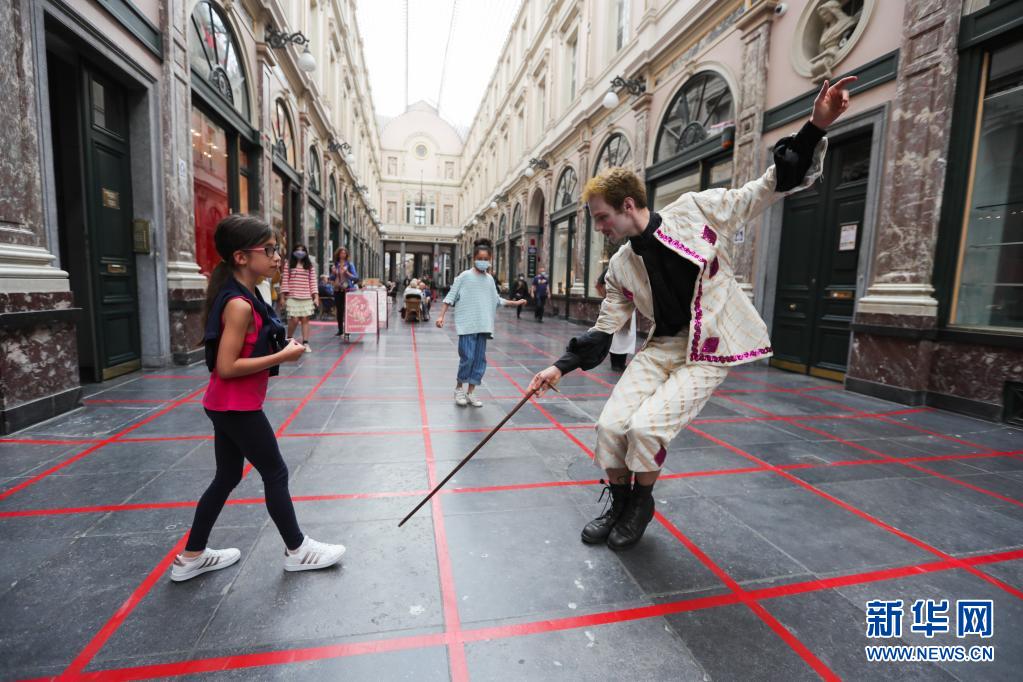 这是2020年7月15日,戏剧艺术家在比利时布鲁塞尔市中心与一名女孩互动“格子游戏”。此互动躲避游戏旨在提示人们在新冠疫情期间注意保持社交距离。新华社记者 郑焕松 摄