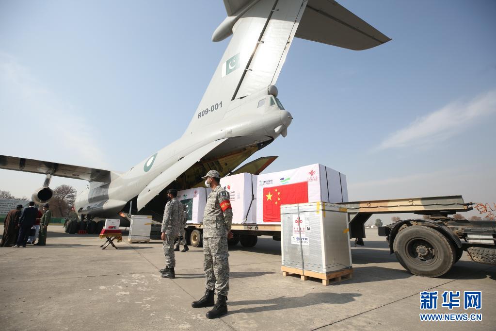 这是2021年2月1日在巴基斯坦首都伊斯兰堡附近的努尔汗空军基地拍摄的中国政府援助新冠疫苗交接仪式现场。新华社记者 刘天 摄