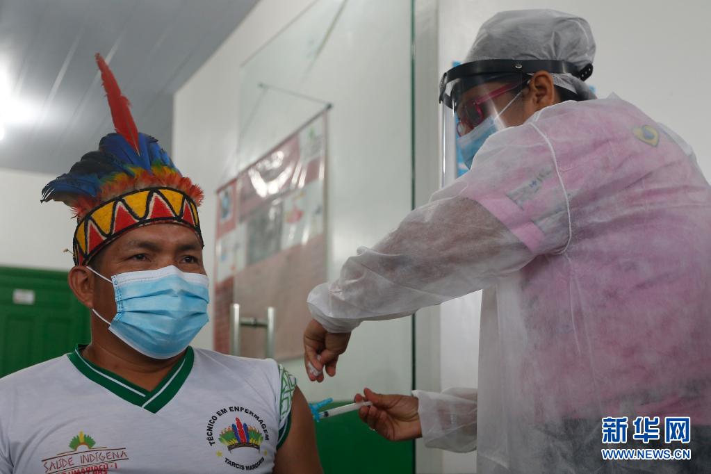 这是2021年1月19日,医护人员在巴西亚马孙州塔巴廷加市为一名原住民接种中国新冠疫苗。新华社发(卢西奥·塔沃拉摄)