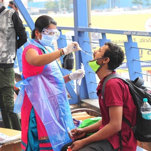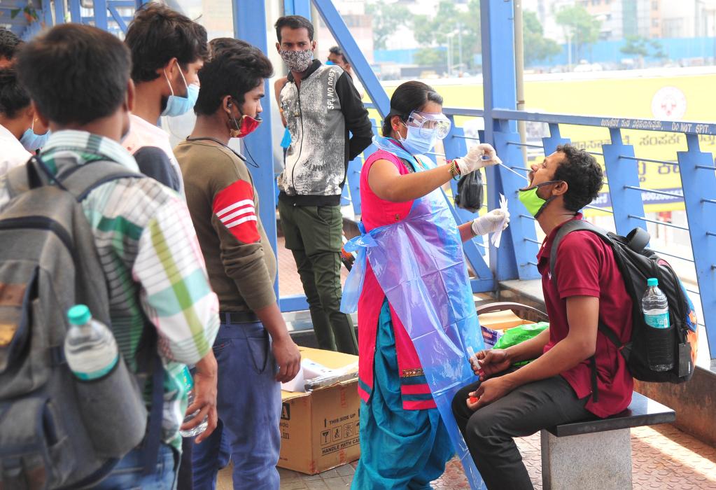 4月11日,一名男子在印度班加罗尔的一个公交站接受新冠病毒检测取样。(新华社发)