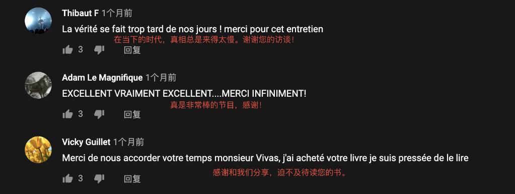 维瓦斯接受法国学术研究团体采访的视频在网上播发后引发强烈反响。网友们评论说:“在当下的时代,真相总是来得太慢。”“维吾尔族问题完全是西方无中生有!”“这位作家说的和我曾在中国亲眼所见的一样!”……