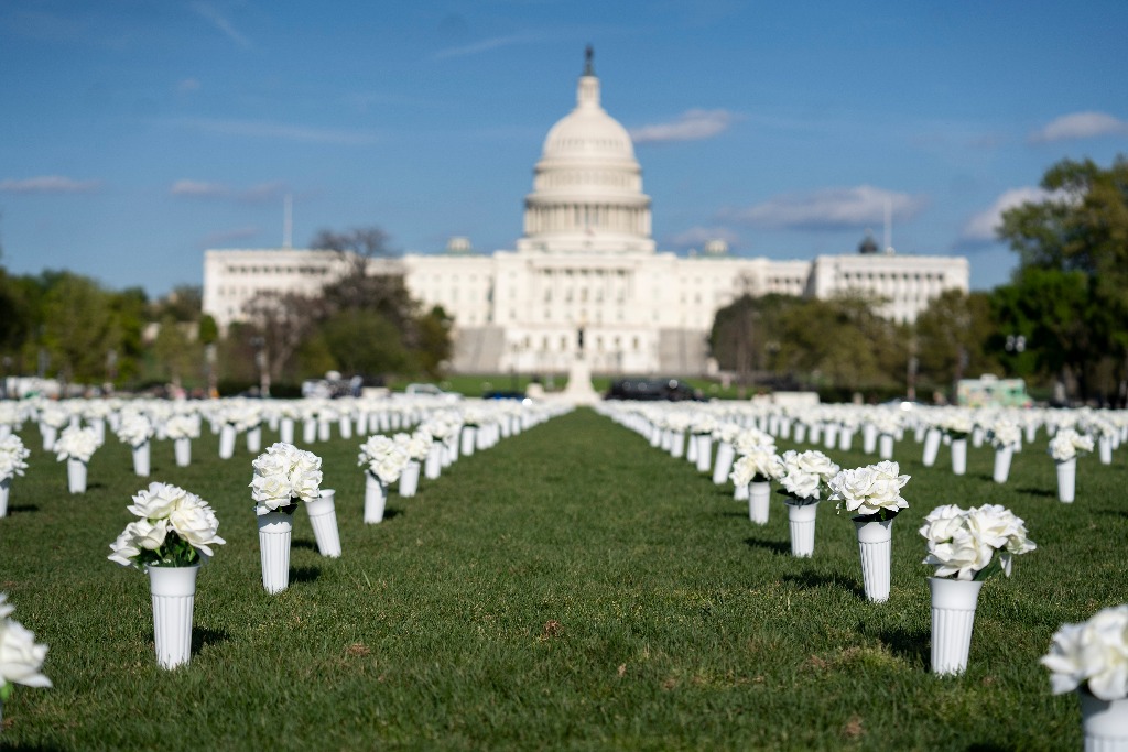 这是4月13日拍摄的美国华盛顿国家广场草坪上摆放的白色绢花。当日,四万朵白色绢花被摆放在国会大厦与华盛顿纪念碑之间的国家广场草坪上,以纪念在全美枪击事件中丧生的人们。据美国媒体报道,2020年美国导致4人及以上伤亡的严重枪击案数量创下历史新高,较2019年激增47%。(新华社记者刘杰摄)