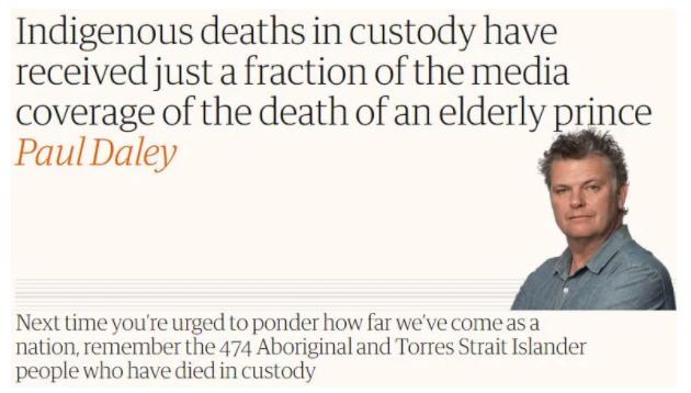 “相比于对英国年迈亲王去世的报道,媒体对土著人在拘押期间死亡的报道只有一点点……下次有人敦促你思考我们作为一个国家已经走了多远的时候,请记住有474名土著人和托雷斯海峡岛民在拘押期间死亡。”