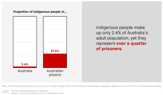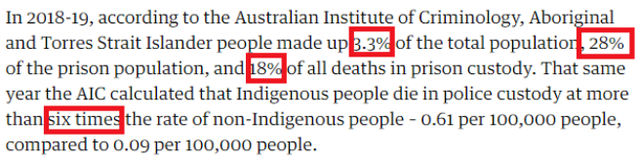 根据澳大利亚犯罪学研究所的数据,2018-2019年,土著居民和托雷斯海峡岛民占澳大利亚总人口的3.3%,却占到监狱服刑人口的28%,占监狱服刑期间死亡人数的18%。同一年,该委员会计算出,土著人在警察拘留期间的死亡率是非土著人死亡率的六倍多。