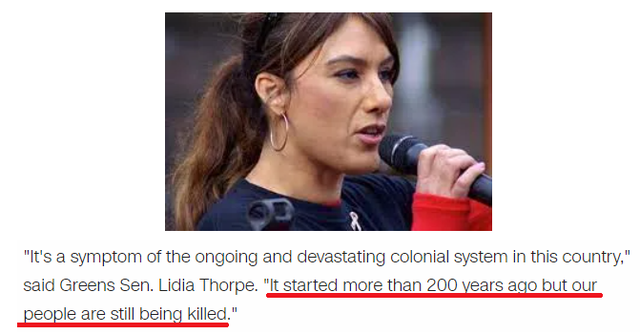 绿党参议员莉迪亚·索普说:“这是这个国家持续存在的破坏性殖民体系的一个症状。它始于200多年前,但我们的人民仍在被杀害。”