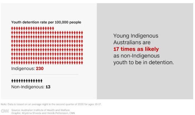 土著人遭遇种族歧视的问题往往始于童年。根据政府的统计数据,尽管10-17岁的青少年中只有6%是土著人,但平均每晚几乎有一半被拘留的青少年是土著。去年一项数据显示,土著青少年被关押的概率是非土著青少年的17倍。