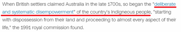 早在1991年,皇家委员会就发现,当英国殖民者在18世纪末占领澳大利亚时,就开始了对土著人的“蓄意和有计划的权利剥夺”,从剥夺他们的土地开始,一直到他们生活的几乎各个方面。