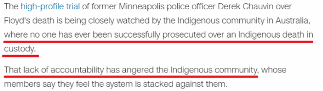 美国有线电视新闻网(CNN)报道指出,在澳大利亚,还没有人因土著人在拘留期间死亡而被成功起诉,缺乏问责制也激怒了土著人社区。