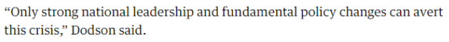 工党参议员帕特·多德森感慨,“只有强有力的国家领导和根本性的政策变革才能避免危机”。