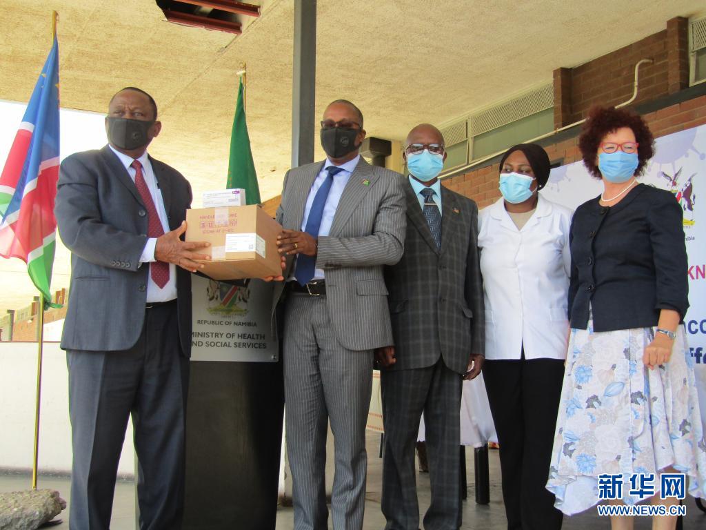 4月16日,纳米比亚卫生部长尚古拉(左一)在温得和克出席仪式接收首批“新冠肺炎疫苗实施计划”疫苗。
