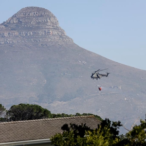 4月20日,在南非开普敦,人们围观参加灭火行动的军用直升机。
