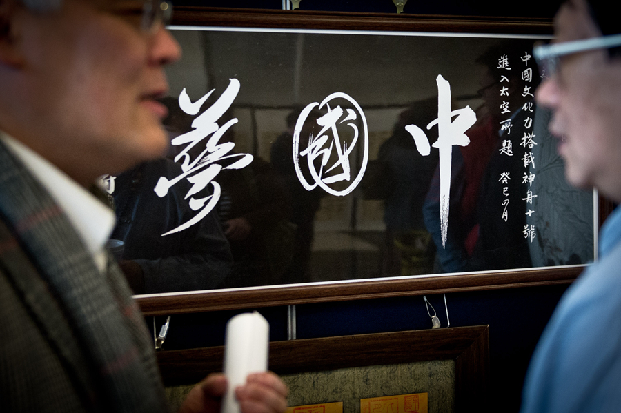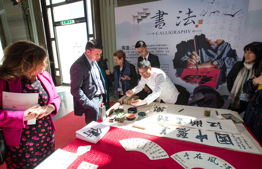 ↑ 来宾在联合国日内瓦办事处举办的中文日活动上观看书法表演(2017年4月19日摄)。