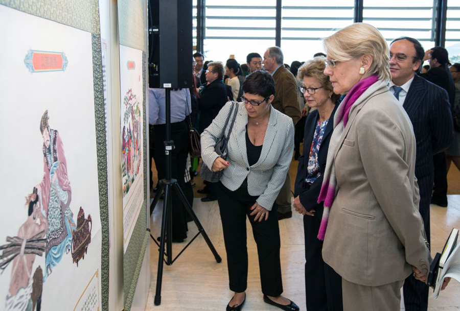 ↑ 来宾在瑞士日内瓦万国宫举办的中文日活动“中国礼仪”剪纸展上参观(资料照片)。