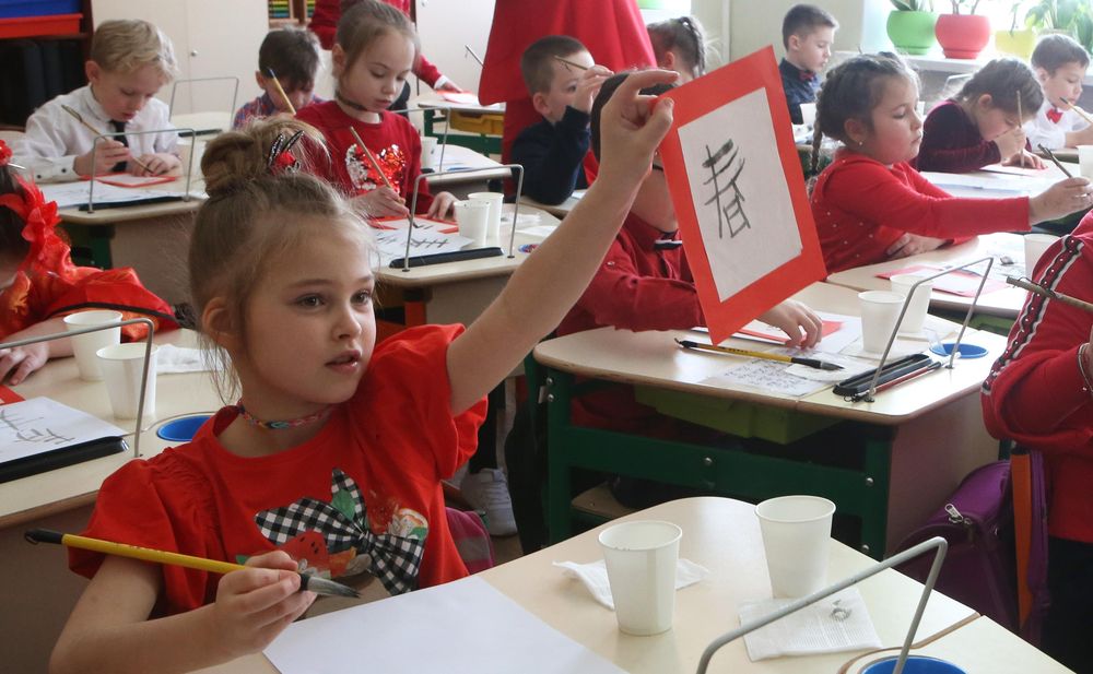 ↑孩子们在乌克兰基辅第一东方语言学校上汉字书法课。