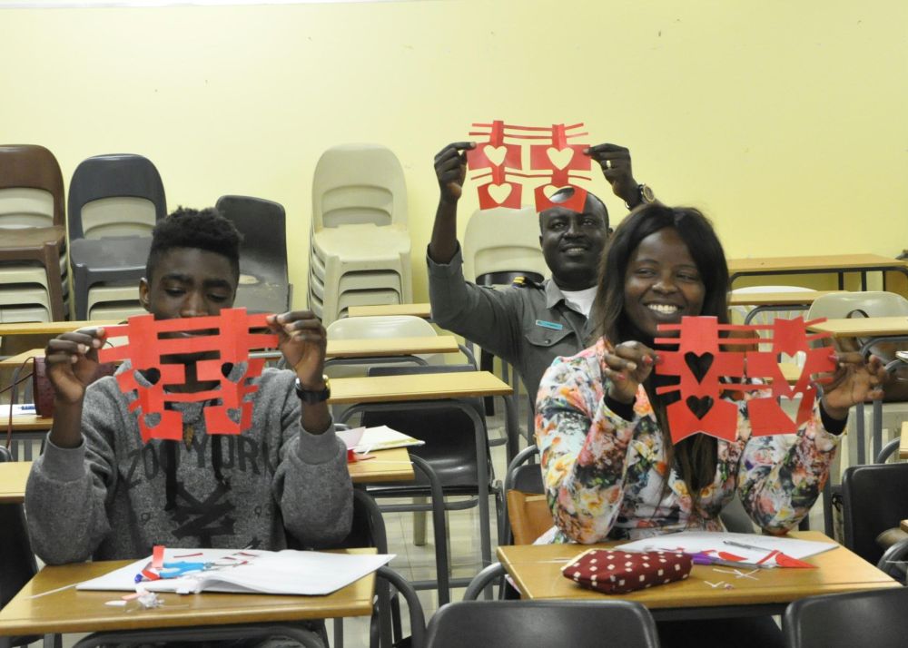 ↑纳米比亚大学孔子学院的学生展示剪纸作品。