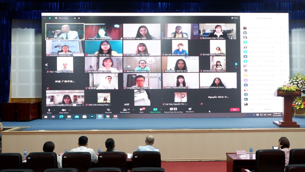 ↑2020年9月12日,在越南首都河内第19届“汉语桥”世界大学生中文比赛越南北部及中部赛区决赛现场,选手通过视频连线方式接受评委点评。全球疫情背景下的“隔空对决”没有影响赛事的精彩,而是更加生动地续写了“汉语为桥、天下一家”