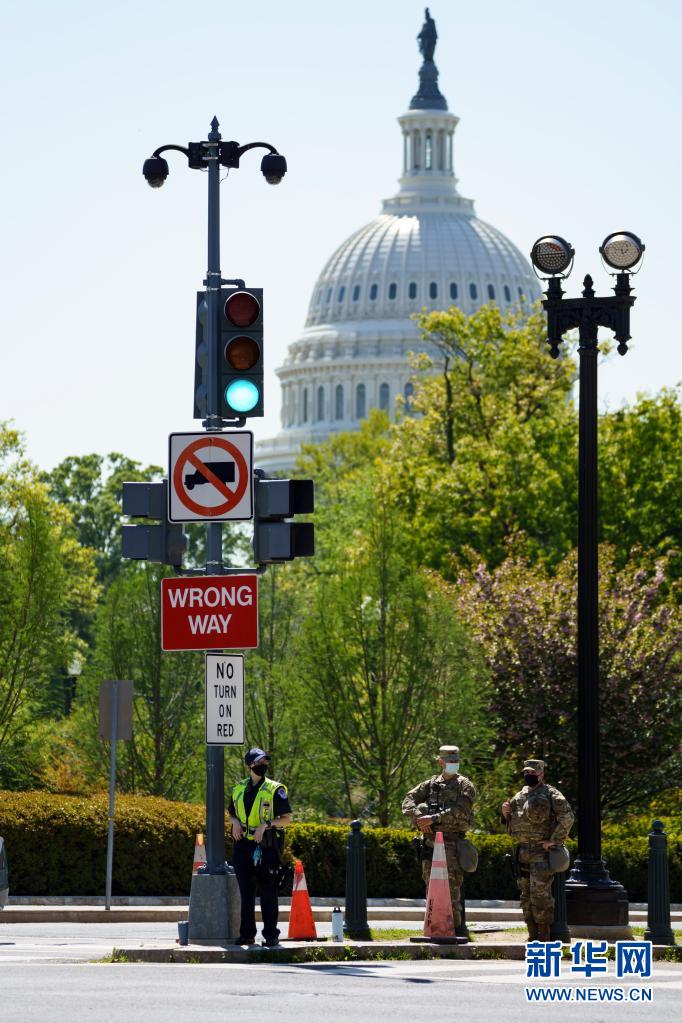 4月20日,在美国首都华盛顿,国民警卫队成员和警察在国会附近警戒。