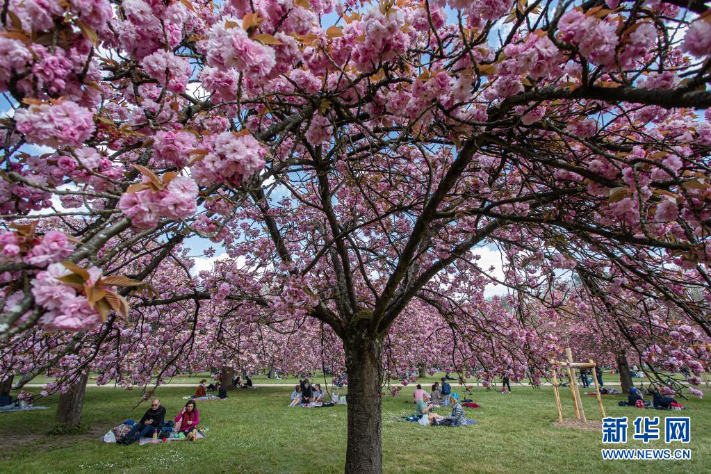 4月20日,人们在法国巴黎近郊的国玺公园欣赏樱花。