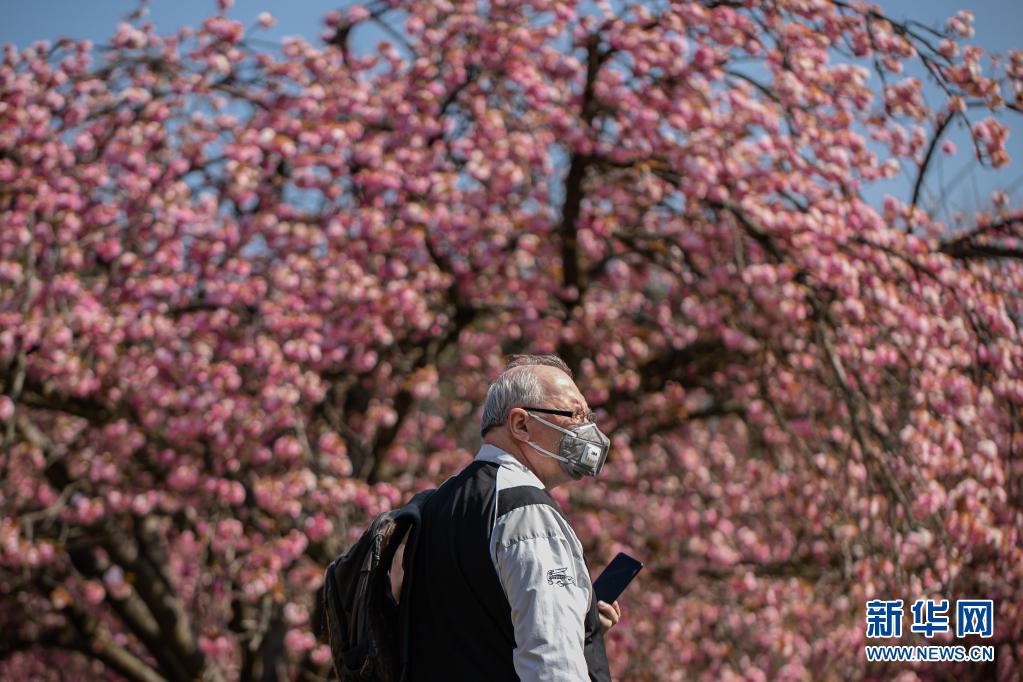 4月20日,一名男子在法国巴黎近郊的国玺公园欣赏樱花。